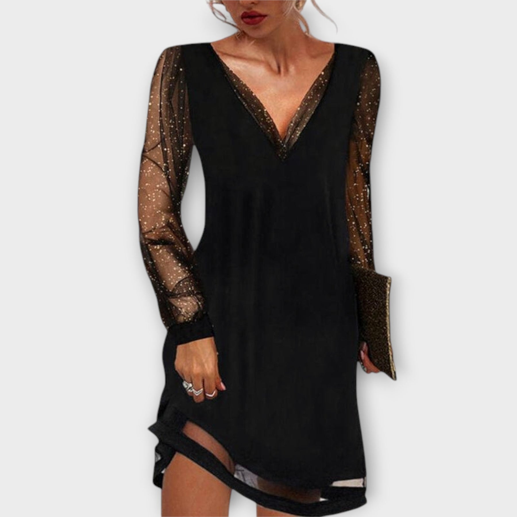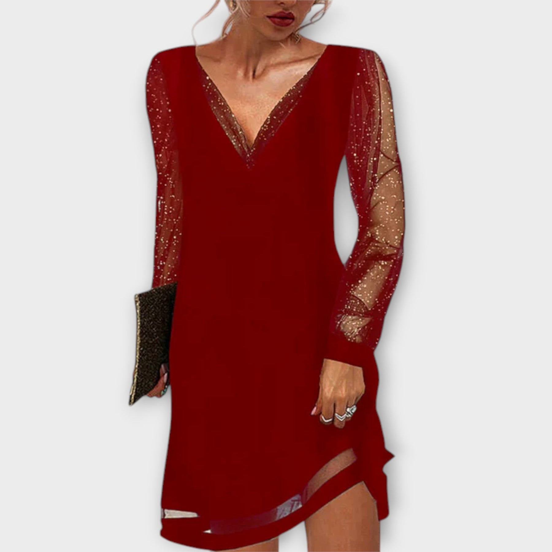 Timeless Elegance: The shimmering sleeves and gracefully designed V-neckline create a refined and sophisticated look, making this dress a standout choice for any setting.