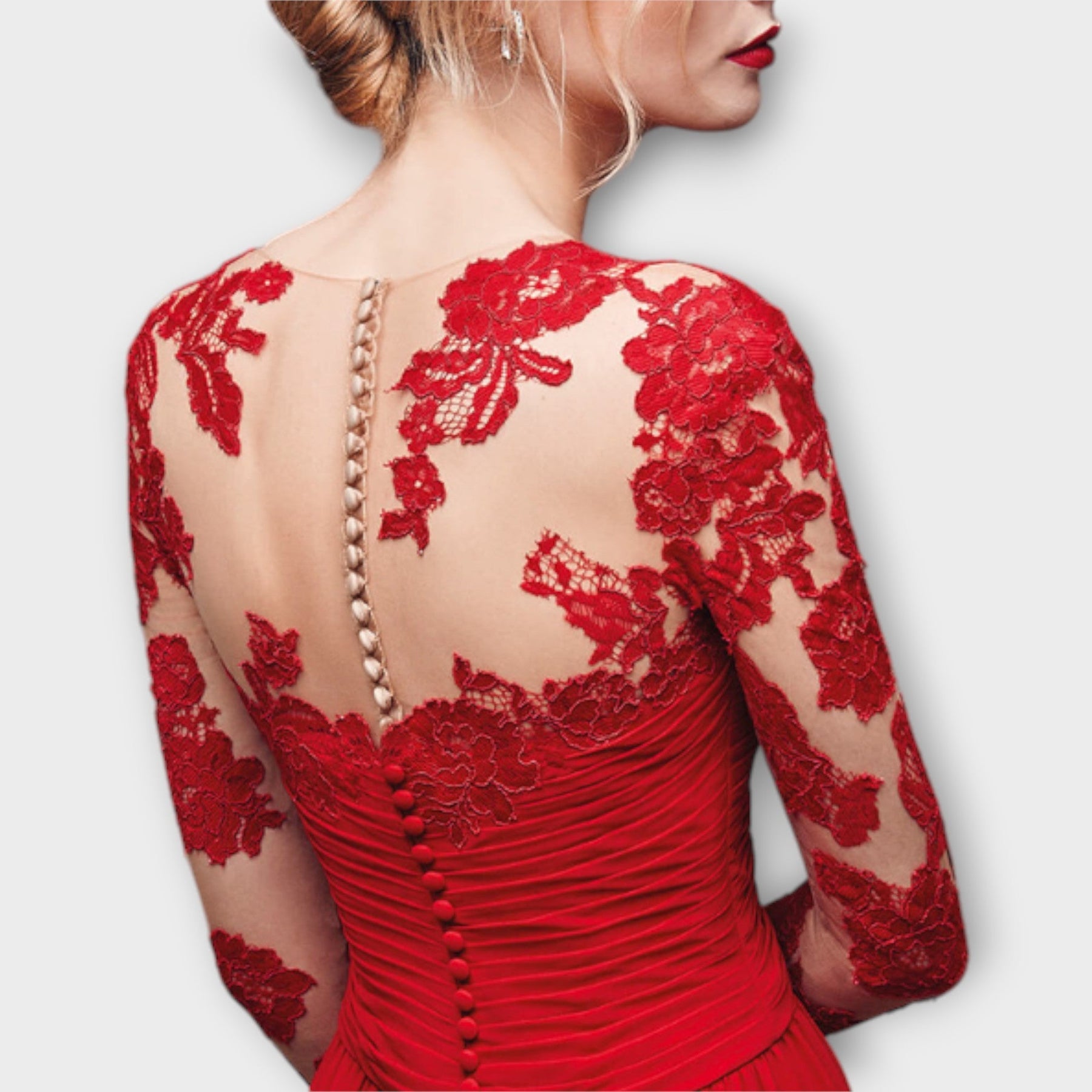 Exquisite Lace Detailing: Delicate floral lace adorns the fitted bodice and sheer sleeves, adding a touch of romantic sophistication to your look.